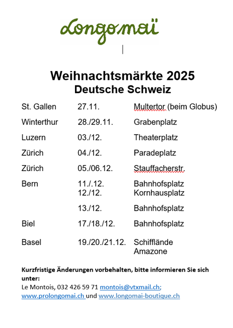 Die Daten der Weihnachtsstände in der Suisse Romande sind unter www.prolongomaif.ch aufgeführt.