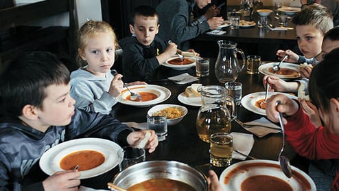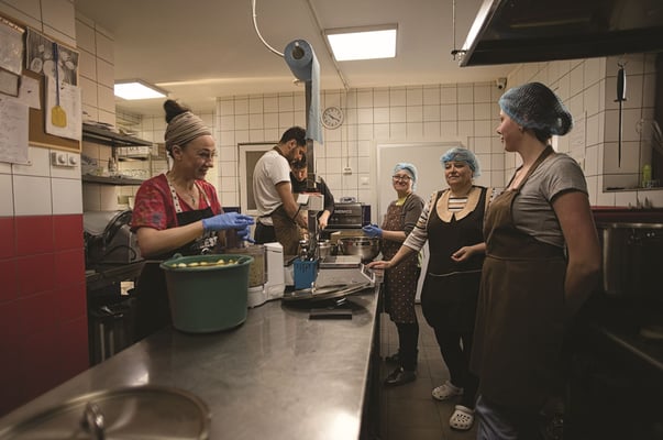 Einheimische und Geflüchtete kochen gemeinsam zweimal am Tag für mehrere hundert Personen im Dorfrestaurant.
